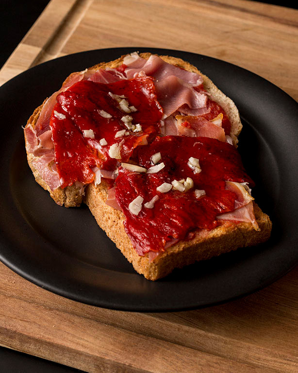 Toast with Garlic, Extra Virgin Olive Oil, Crushed Organic Tomato, Raw Serrano Ham and Organic 'Piquillo' Pepper. Contains gluten .
